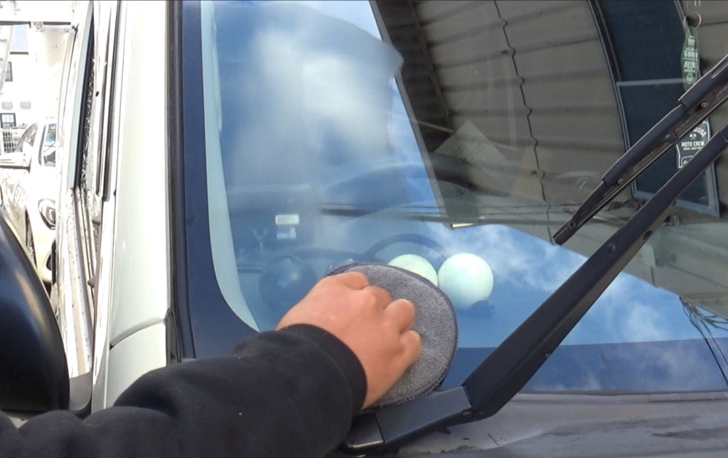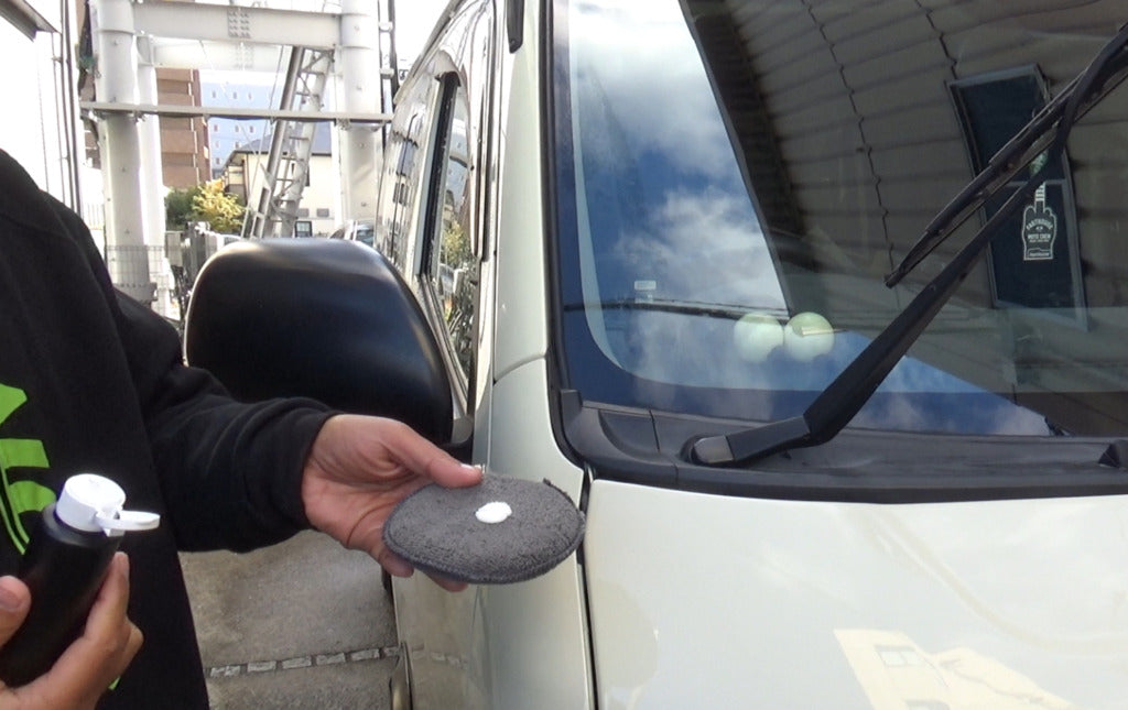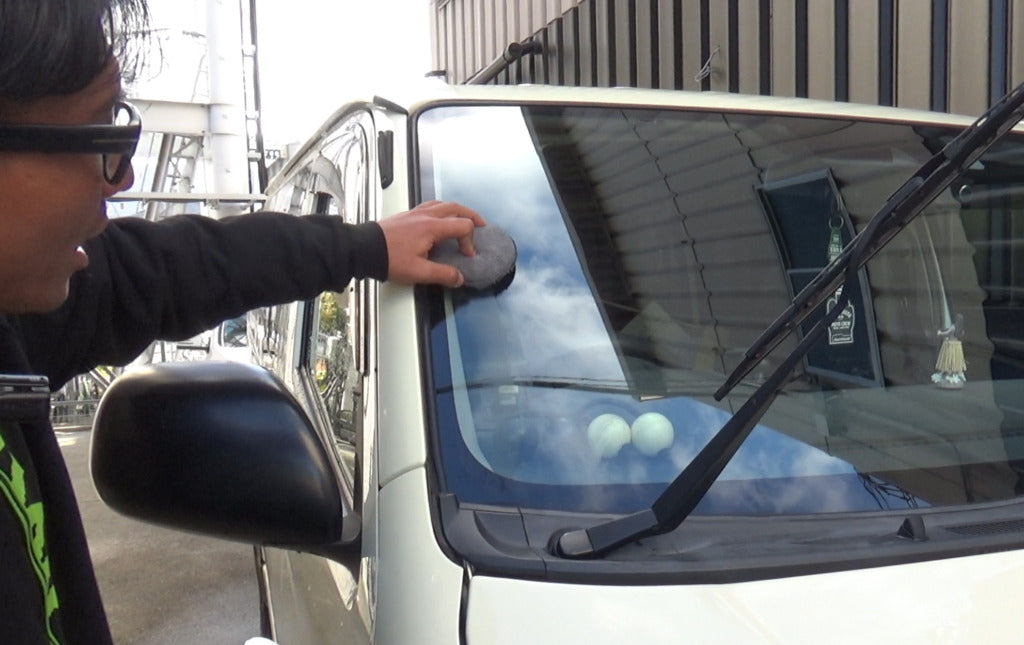 洗車後、濡れた窓に施工してください。 ガラスの下地処理として、 頑固な油膜や水アカウロコをこすってはがします。 コーティング剤の効果をアップさせてくれます。