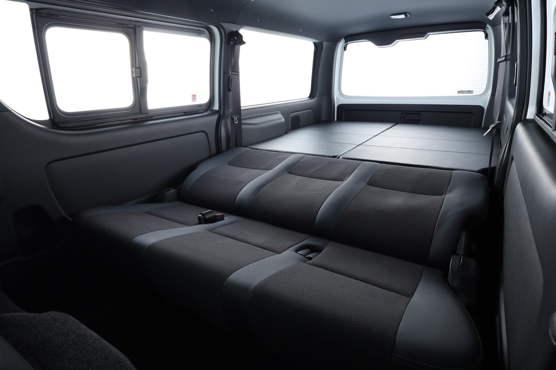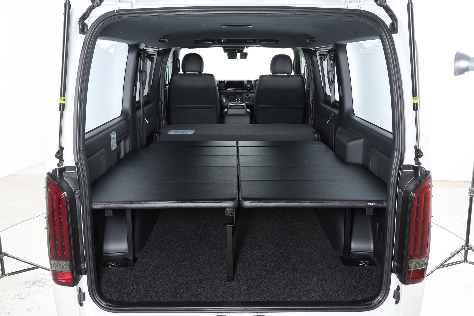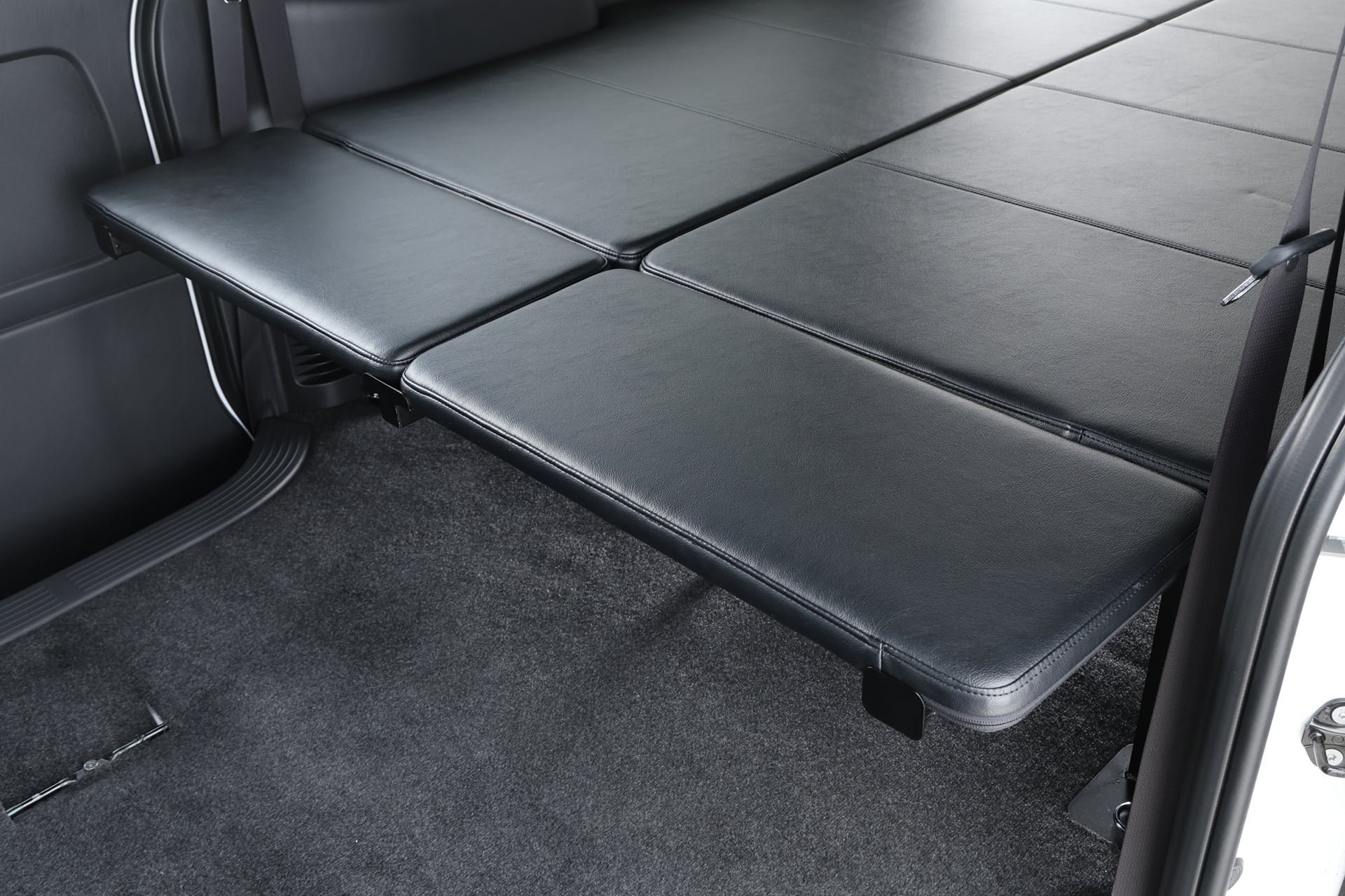 左側のみをベッドとして使用し右側を荷物スペースにしたり、両側を収納して大きな荷物を積んだり、展開して広々としたフルフラットベッドにしたりと、荷物の量や用途に合わせた自由なレイアウトが可能です。