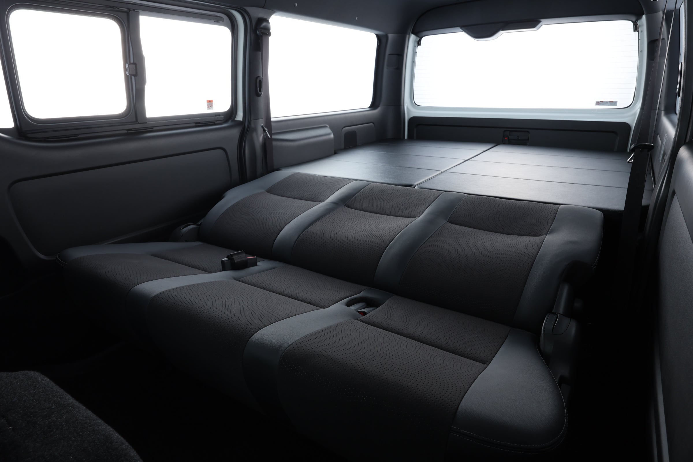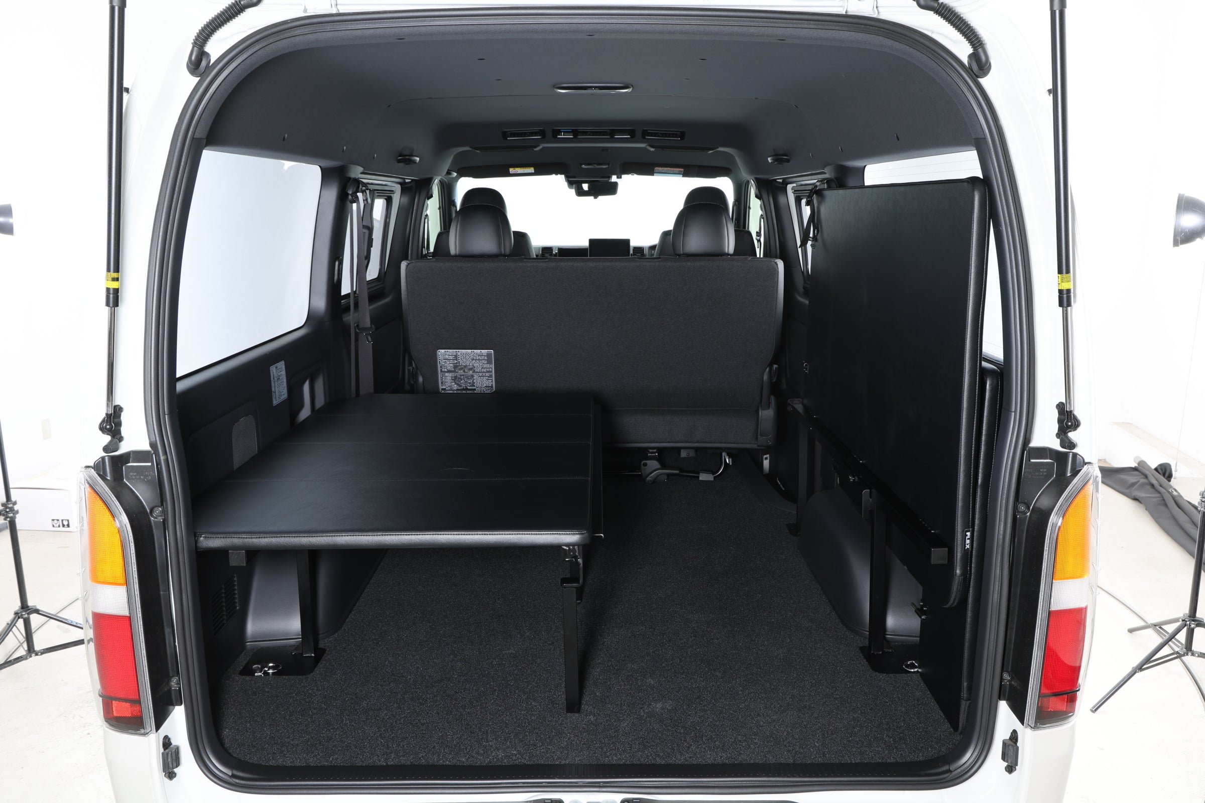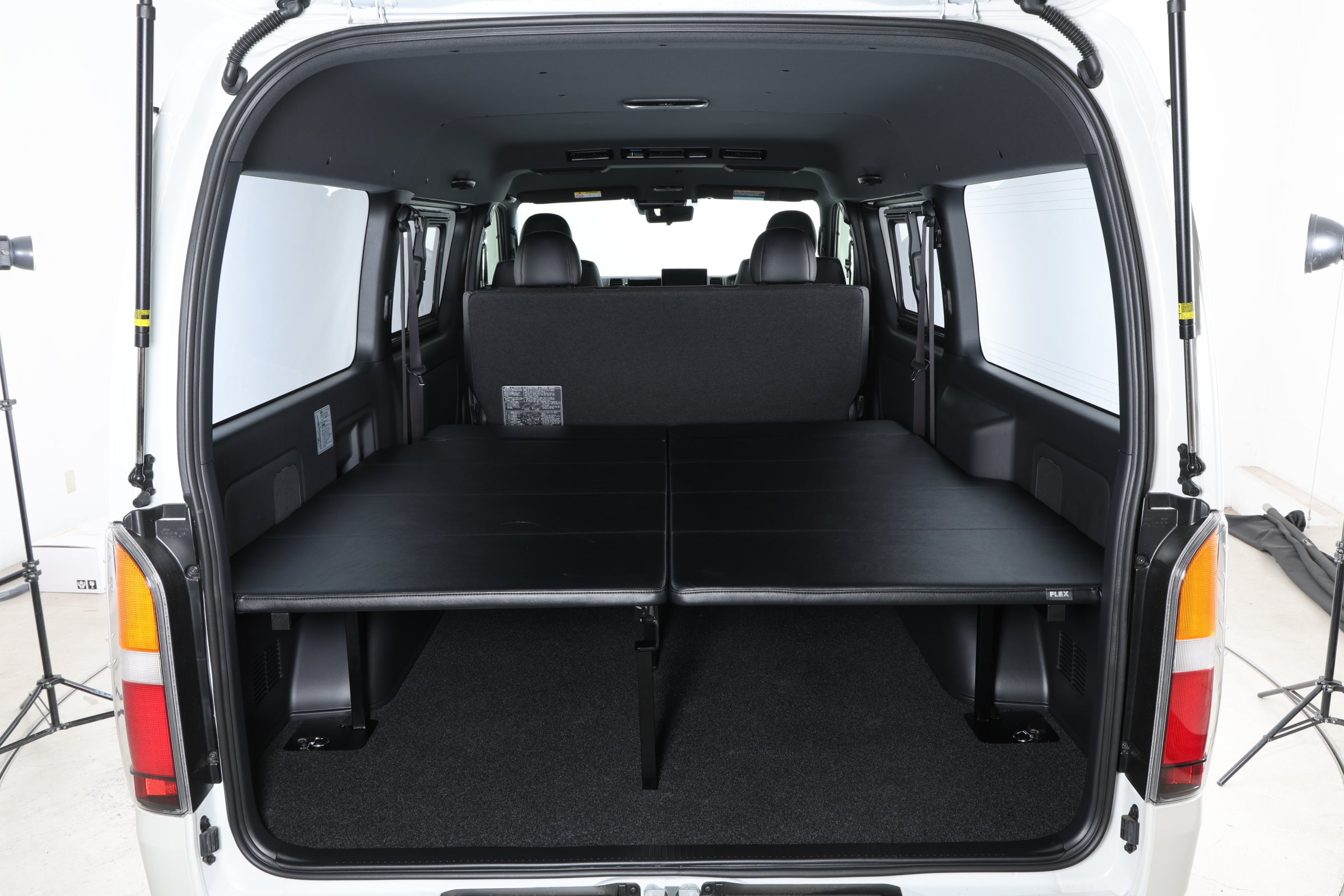 片側をベッド、反対側を荷室として使ったり、両側を収納して大型の荷物を積載したり、展開して広々としたフルフラットベッドとして使用することも可能。
