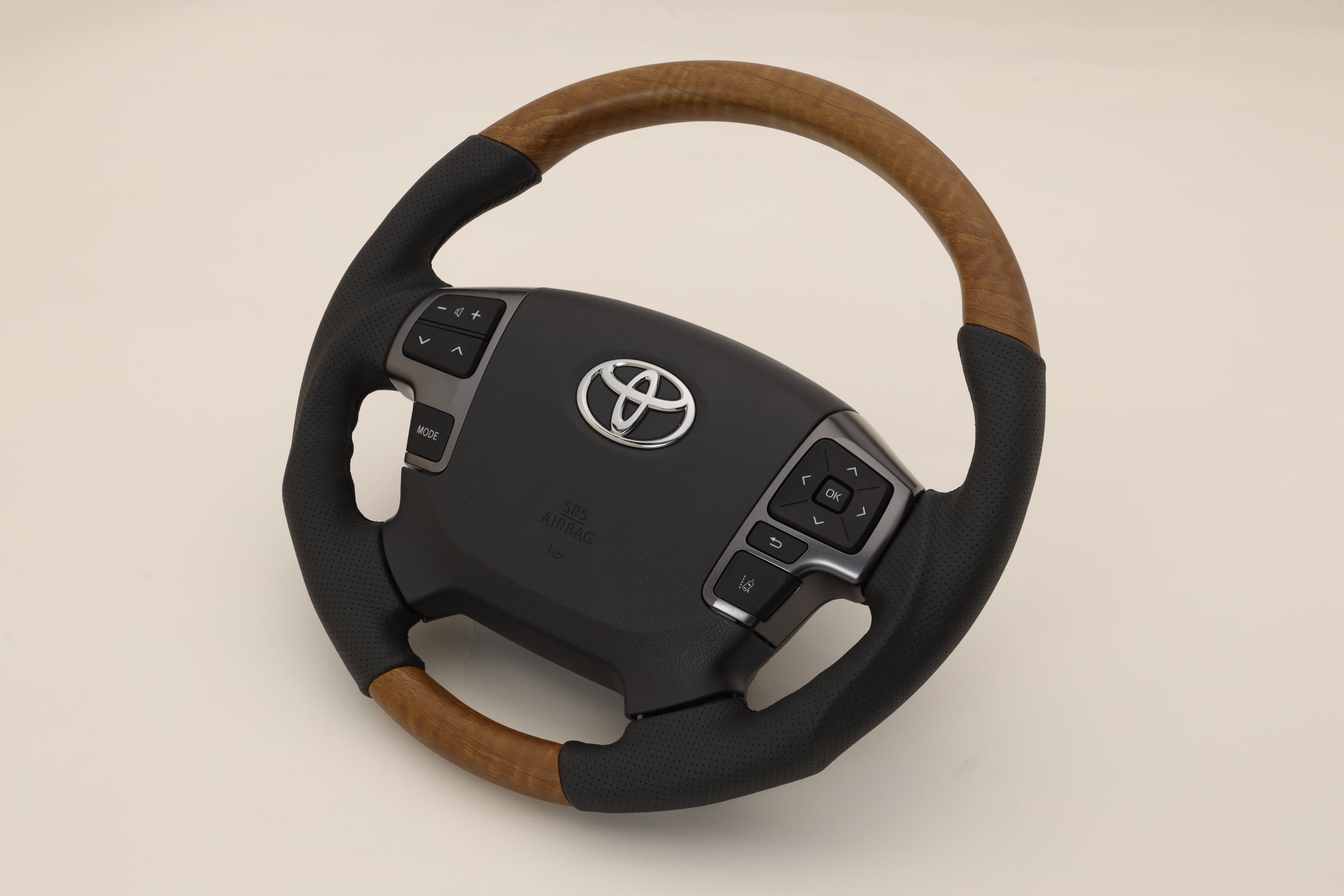 木目部分には難燃素材(FR-ABS)、レザー部分には難燃PVCレザーを採用し、安全性にも配慮したドレスアップステアリングです。