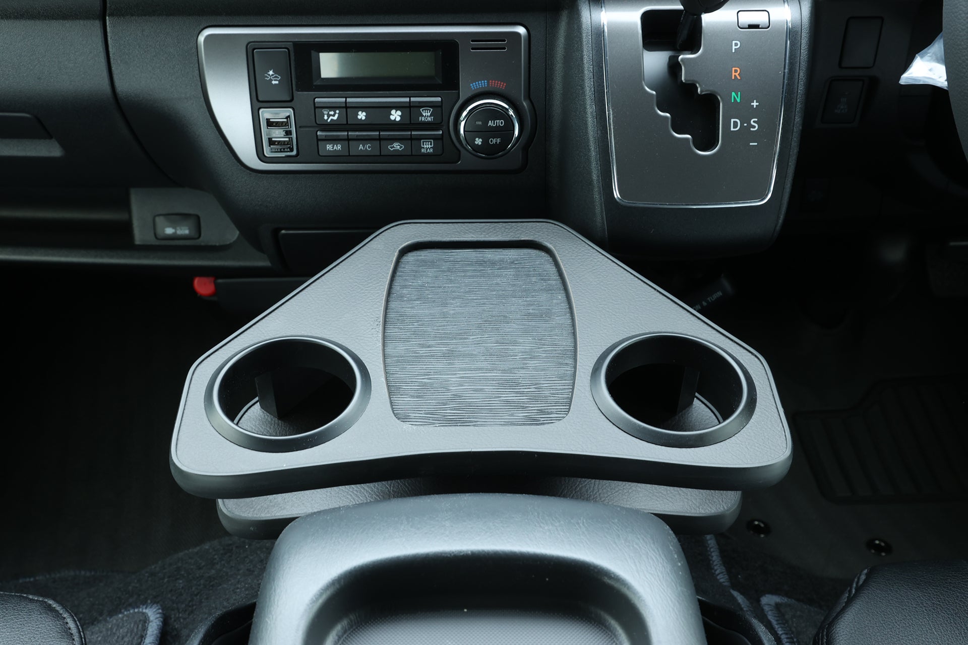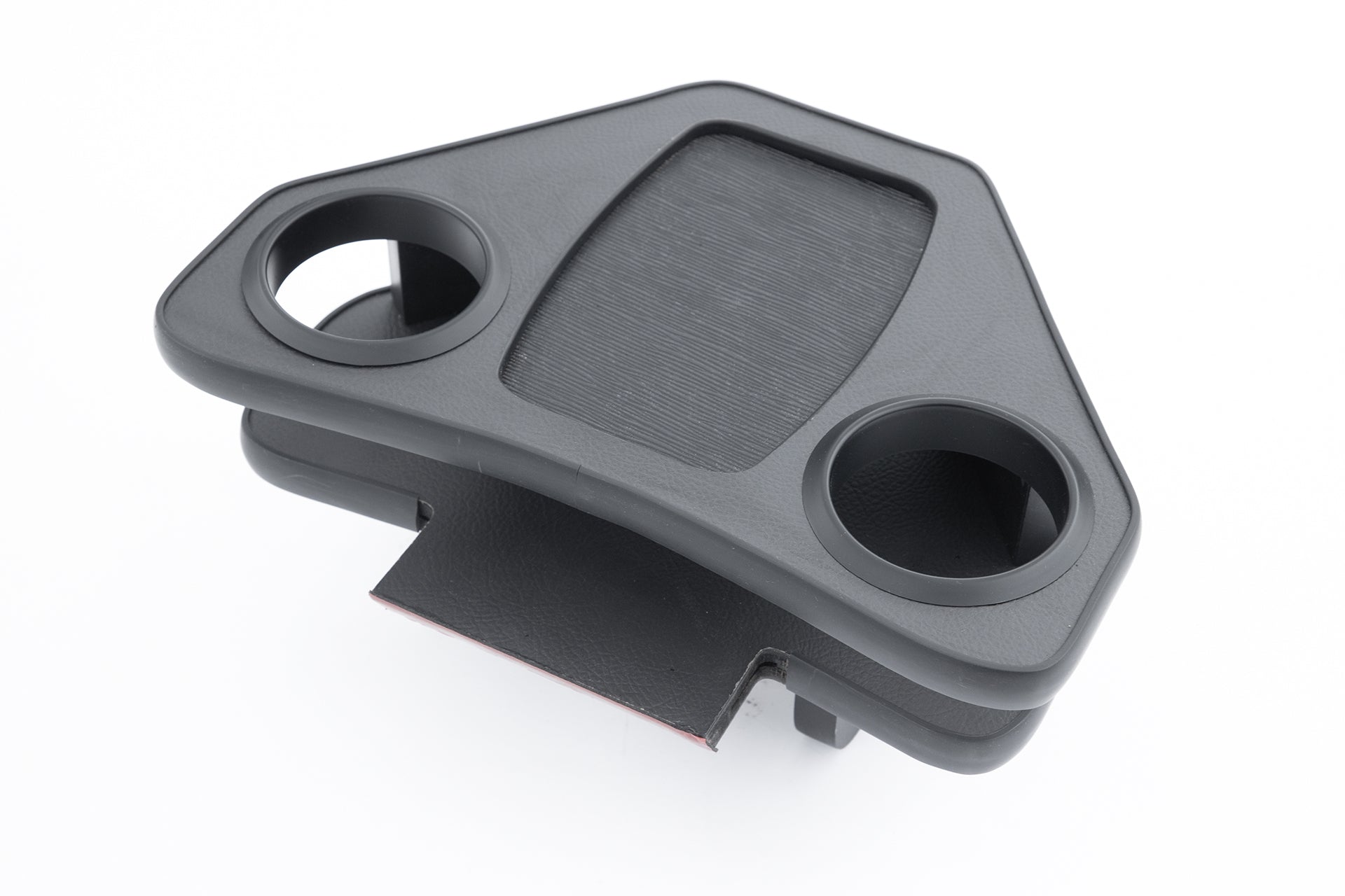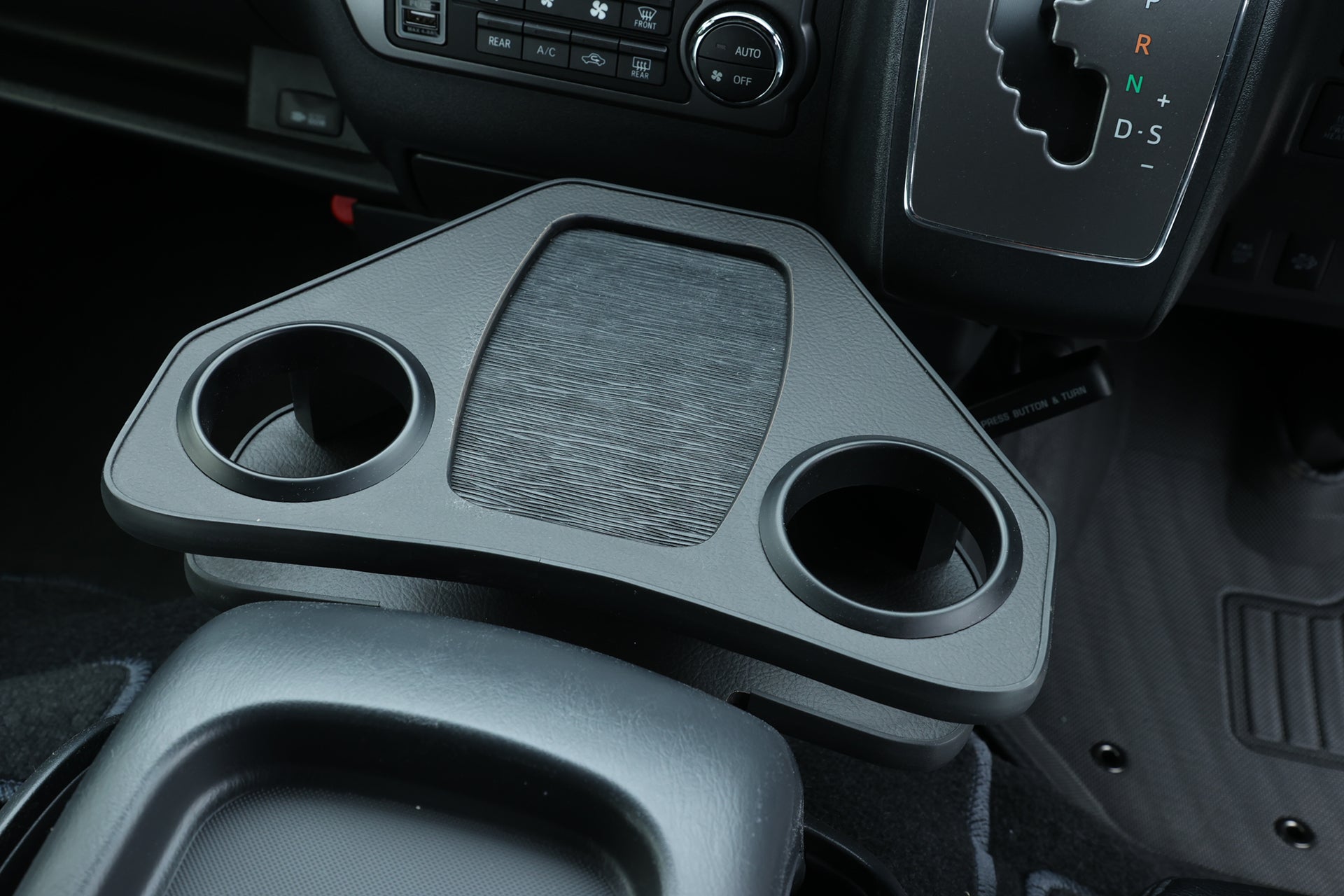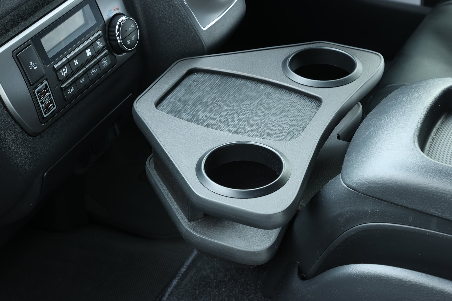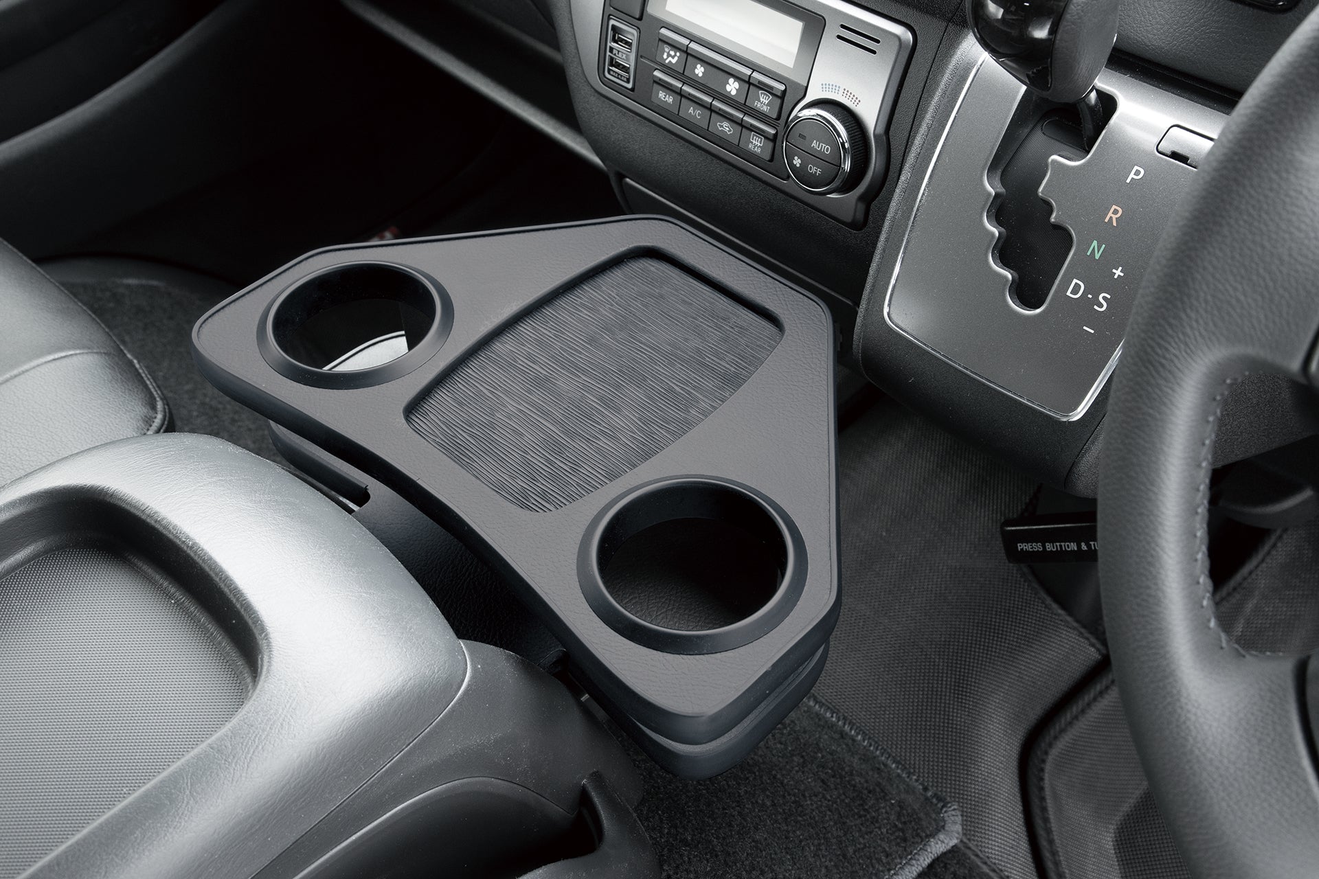 ドリンクホルダー2個に加え、小物が置けるトレイを備えたスタイリッシュな前席用カップホルダー。